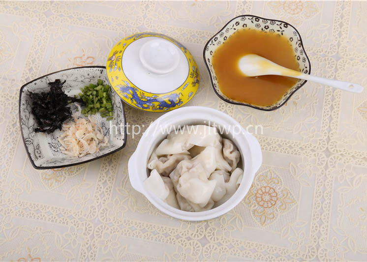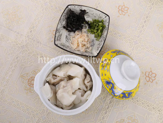 2.鍋內加水,煮沸后加入餛飩,煮熟后將餛飩撈出至湯碗中;