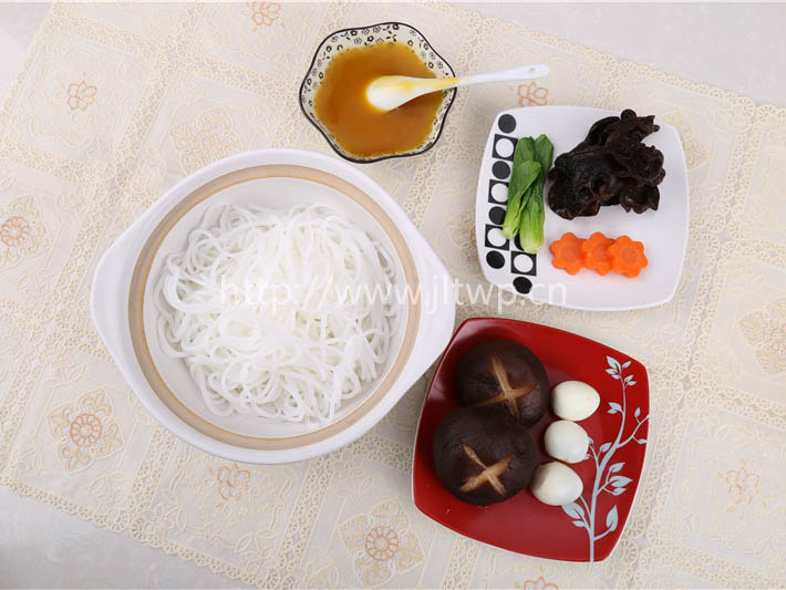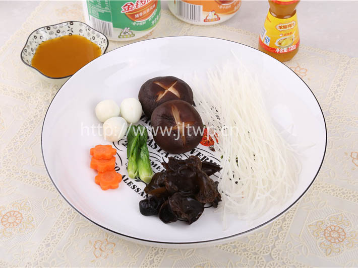 1.米線提前用溫水浸泡至柔軟,雞蛋煮熟后切半,油菜、香菇、木耳開水燙熟備用;
