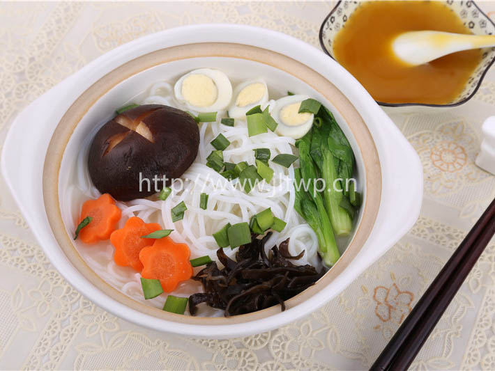 3.將浸泡好的米線加入沸水中,煮熟后撈出,放入盛好湯的湯碗中,加入雞蛋、小油菜、香菇、木耳即可。