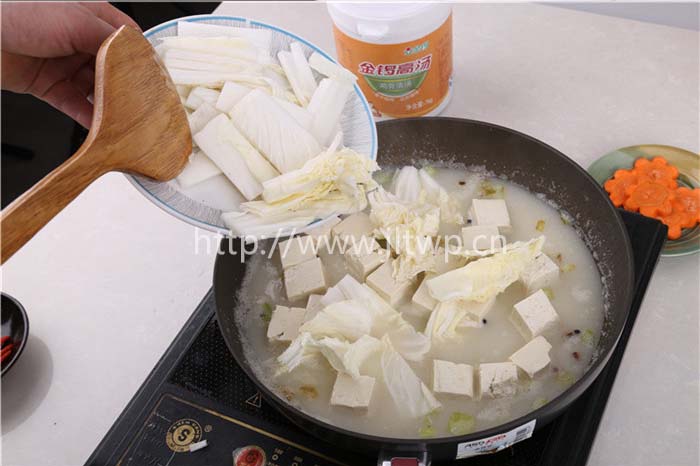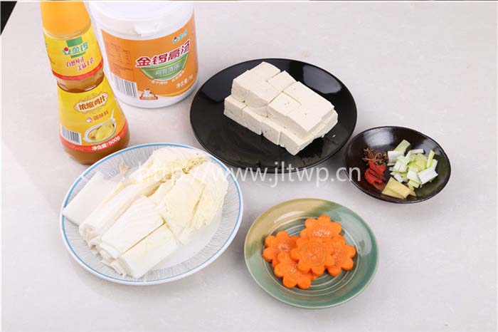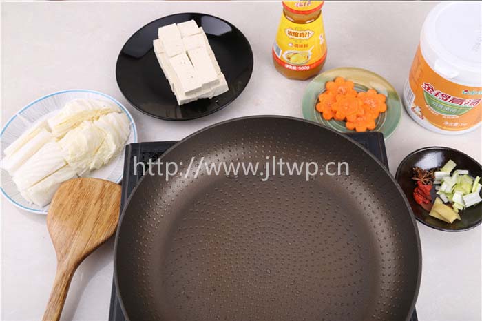 1.白菜洗凈后切長(zhǎng)片,豆腐切塊,胡蘿卜切片備用;