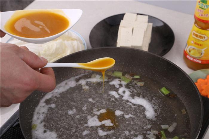 主料: 1.金鑼濃香雞骨高湯20g 2.金鑼雞汁10g 3.白菜150g 4.老豆腐150g 5.食鹽8g 6.白砂糖4g 7.胡蘿卜適量 8.水1.5Kg