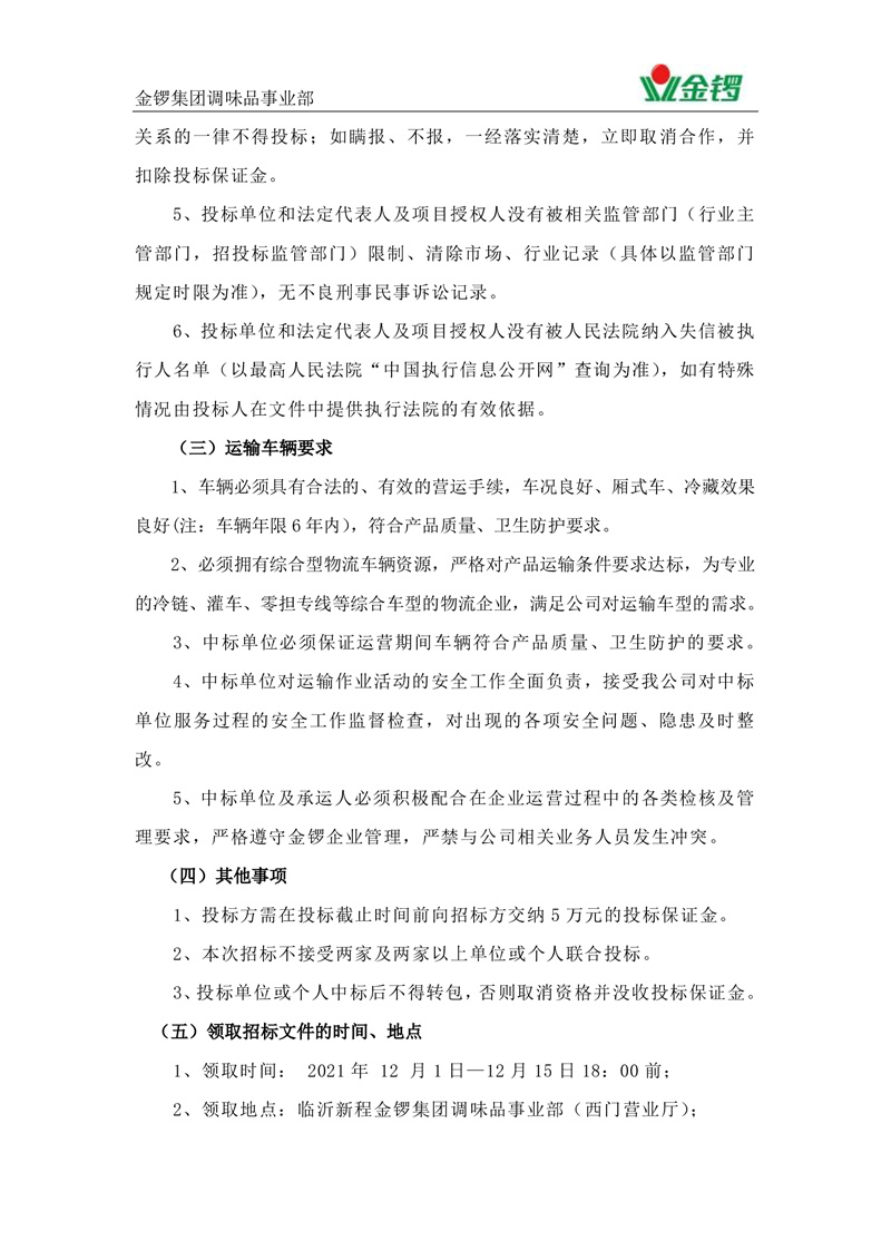 調味品事業部2022年運輸招標公告